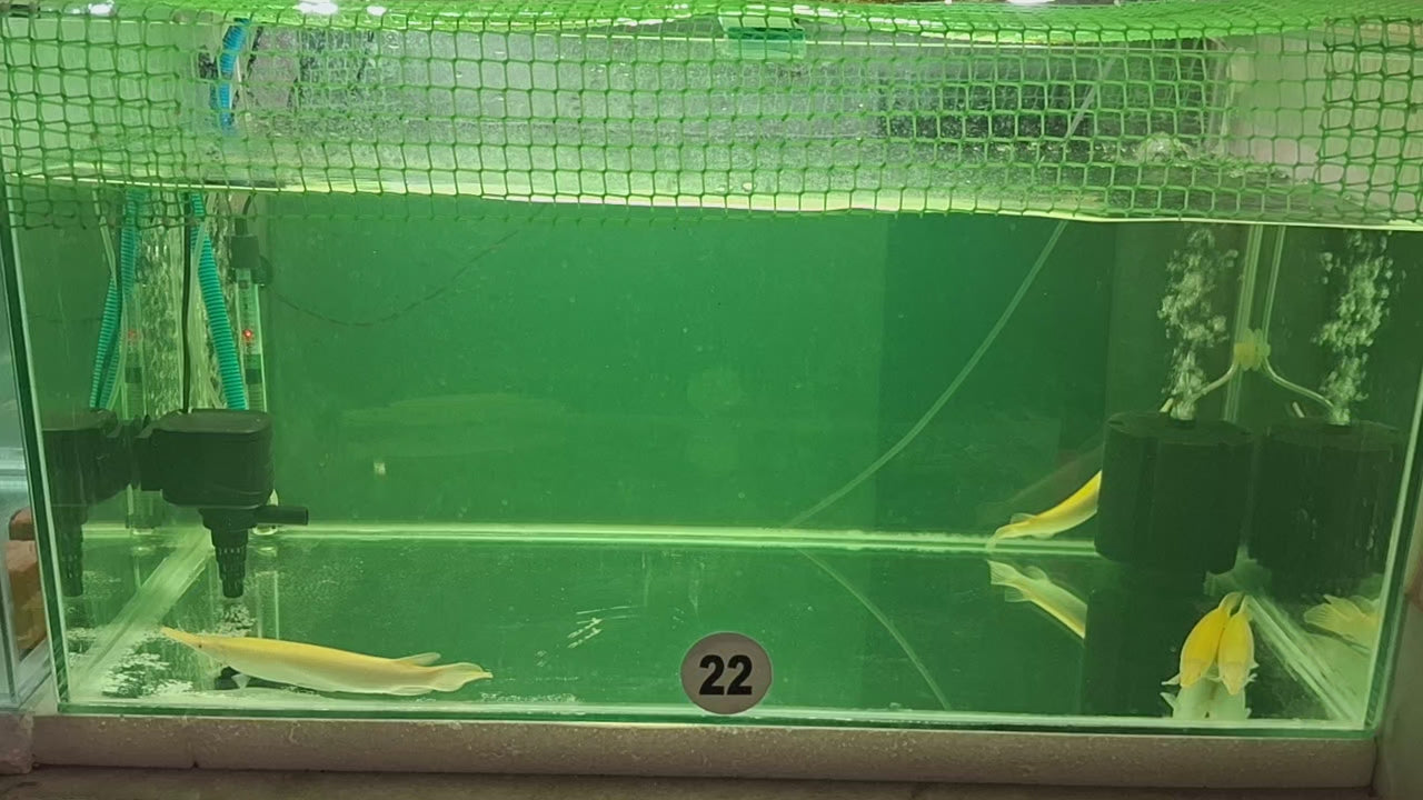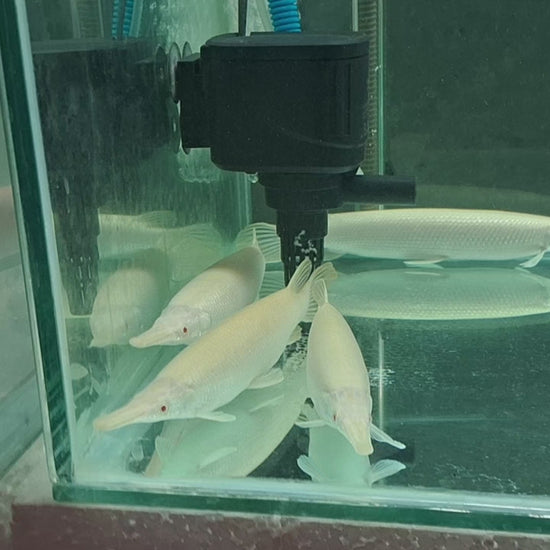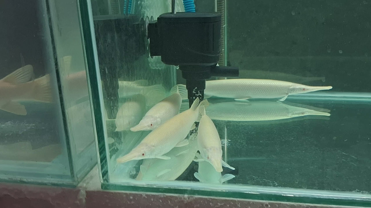 Albino Florida gar are a rare color variation of the Florida gar (Lepisosteus platyrhincus), characterized by a pale, yellowish or white body and distinctive red eyes. They are a predatory species native to the southeastern United States, known for their elongated bodies and needle-like teeth, making them effective hunters of smaller fish. These fish are popular in the aquarium trade due to their unique appearance, but they require large tanks and careful management due to their predatory nature and size.