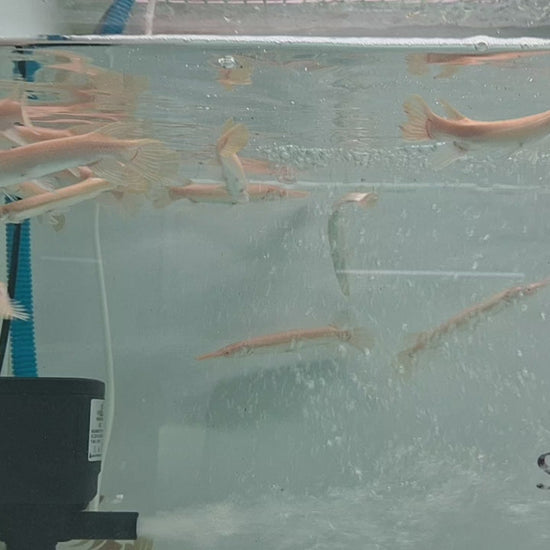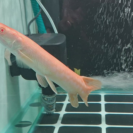 This is a rare albino color morph. This is the newest color morph available. Previously there was the platinum or leustic types, but this albino is different in a few ways. The eyes are translucent red and the body is slight shiny yellow. Alligator gar are relatively passive, seemingly sluggish solitary fish, but voracious ambush predators. They are opportunistic night predators and are primarily piscivores, but they will also ambush and eat water fowl and small mammals that may be floating on the surface.