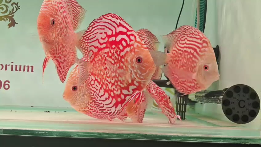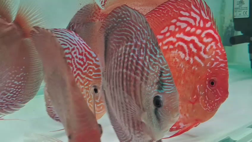 Discus fish (King of Freshwater) or Symphysodon discus are known for their distinctive, round, and laterally compressed body shape, which gives them their name and makes them a popular aquarium fish. They feature a variety of bright, patterned colors, including shades of blue, green, red, and brown, which are often patterned with wavy vertical or horizontal lines. These freshwater cichlids, native to the Amazon River basin, can grow to be 12.3 to 15.2 cm (4.8 to 6.0 inches) in length and are notable for their dedicated parental care, where adults secrete a mucus to feed their young.